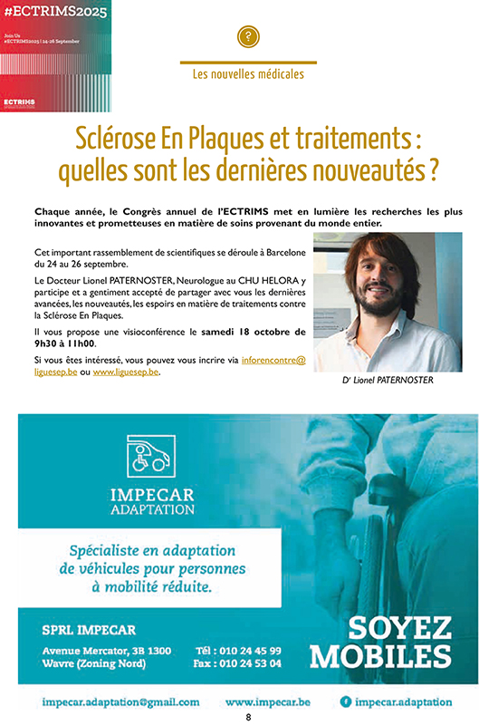 Les informations recueillies sont à usage exclusif de la Ligue Belge de la Sclérose en Plaques - Communauté Française ASBL et ne sont pas transmises à des tiers. Un droit d'accès et de modification vous est attribué par la loi du 8 décembre 1992 sur la protection de la vie privée.